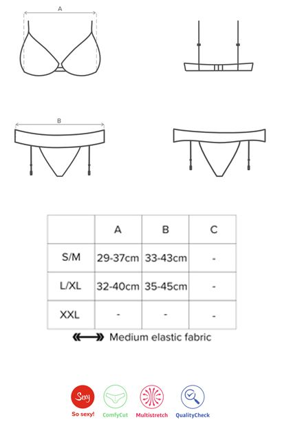 Το σλιπ, επίσης δαντελένιο, συνδυάζεται με ζαρτιέρες που χαρίζουν έντονο ερωτικό χαρακτήρα και αναδεικνύουν τη σιλουέτα με εντυπωσιακό τρόπο. Οι κάλτσες δεν περιλαμβάνονται, δίνοντάς σας την ελευθερία να τις συνδυάσετε όπως εσείς θέλετε.